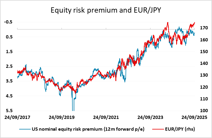 A fairly quiet start in Europe with the main focus of the morning likely to be the SNB meeting at 08:30 UK time. However, EUR/JPY has continued to rise, reaching another new post July 2024 high, and threatening the all time high at 175.40 reached then. There is no obvious driver for the mobve other than momentum, but the all time high is a clear target and may need to be broken before there can be any reversal.