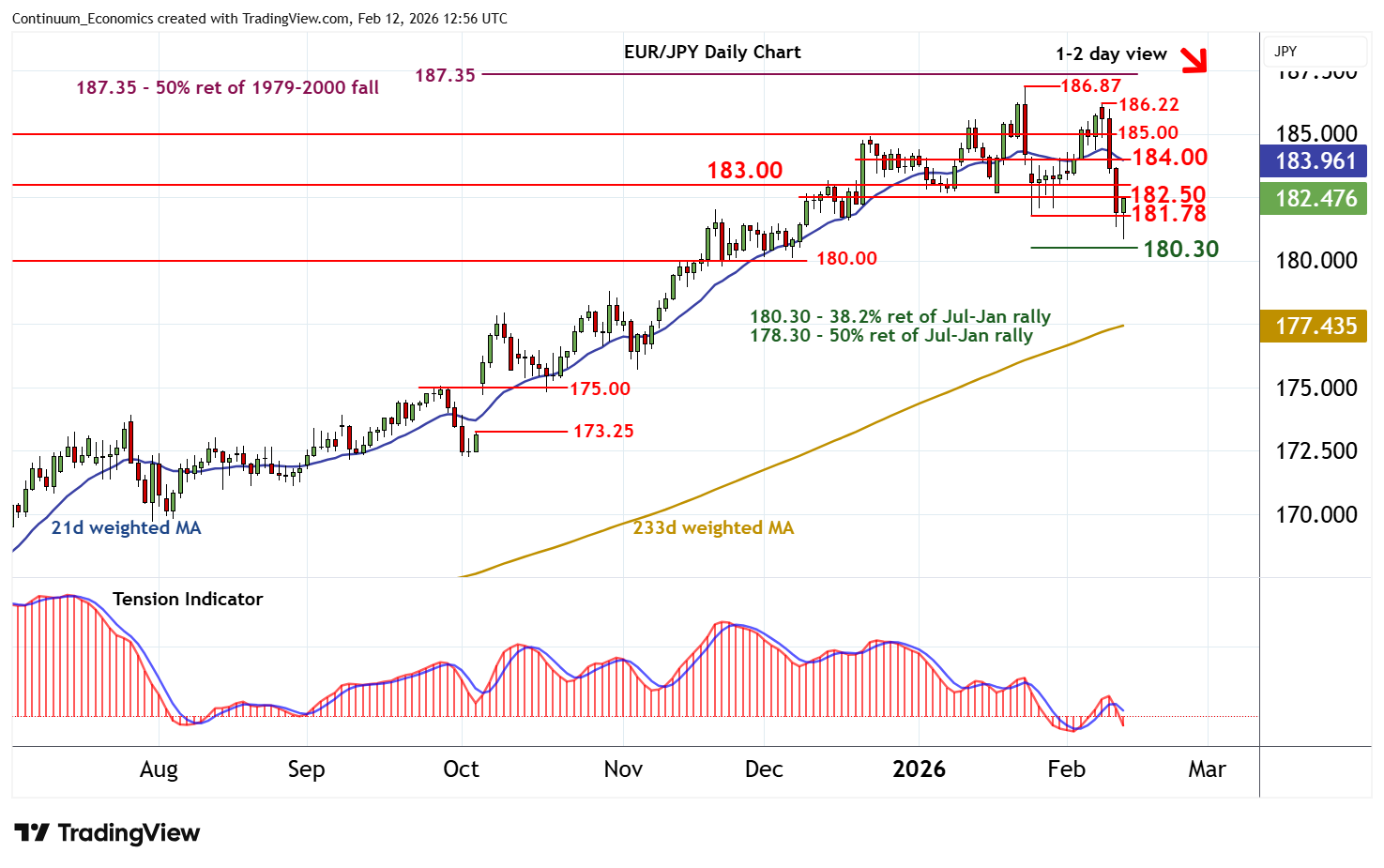 12:30 GMT - The anticipated break below the 181.78 monthly low of 26 January has posted a fresh 2026 year low around 180.85, before bouncing sharply to currently trade around 182.40. Rising intraday studies highlight potential for a test above resistance at 182.50 towards 183.00. But negative daily readings and falling weekly charts should prompt renewed selling interest towards here. A close above here, however, would help to stabilise price action and prompt consolidation beneath congestion around 184.00. Following cautious/corrective trade, fresh losses are looked for. A close below 181.78 will add weight to sentiment and extend January losses towards the 180.30 Fibonacci retracement.