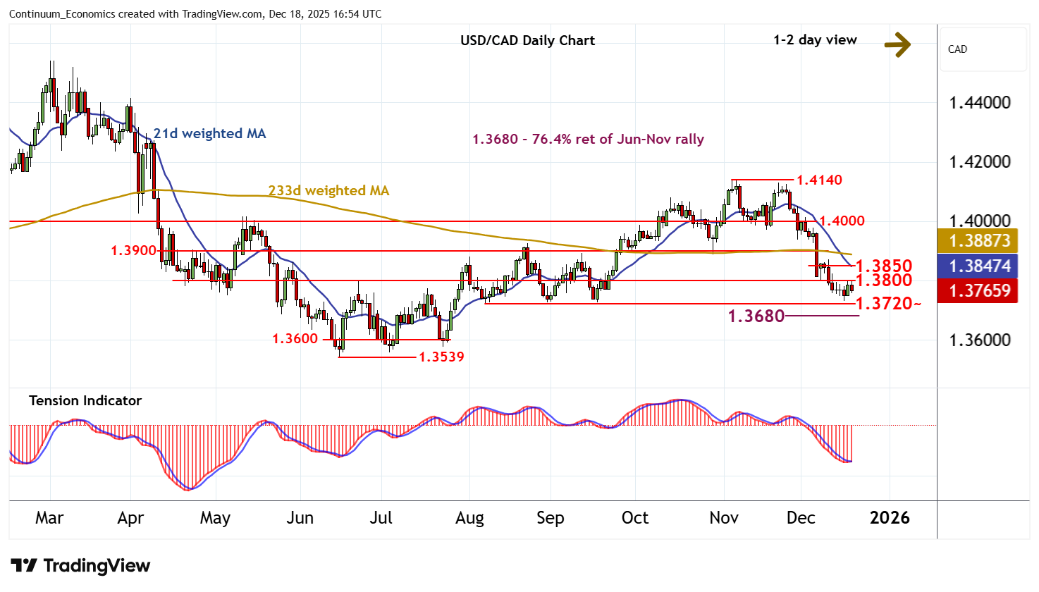 16:40 GMT - Little change, as prices extend consolidation beneath congestion resistance at 1.3800. Intraday studies are under pressure, highlighting room for drift lower. But mixed daily readings are expected to limit initial scope in further consolidation above support at the 1.3720~ lows from August-September. Broader weekly charts continue to fall, however, pointing to room for a later break beneath here and extension of November losses towards the 1.3680 Fibonacci retracement. Flat oversold daily stochastics could limit any initial tests in consolidation/short-covering. Meanwhile, a close above 1.3800, if seen, should give way to further range trade beneath further congestion around 1.3850.