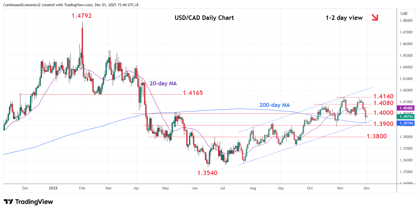Sharply lower through support at the 1.4000 congestion and 1.3970 support to confirm a double top at the 1.4130/40, November highs