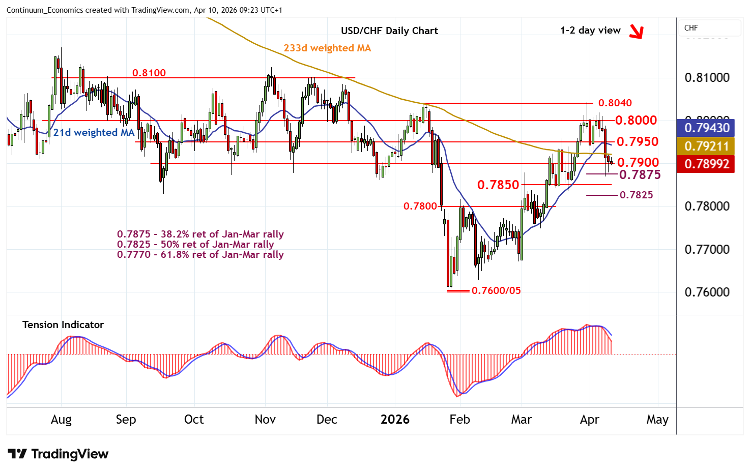 09:15 BST - Little change, as prices extend cautious trade above congestion support at 0.7900. Daily readings continue to point lower and overbought weekly stochastics are unwinding, highlighting room for fresh losses in the coming sessions. However, a close below the 0.7875 Fibonacci retracement is needed to turn sentiment negative and extend late-March losses initially towards 0.7850. Meanwhile, resistance remains at congestion around 0.7950 and should cap any immediate tests higher.