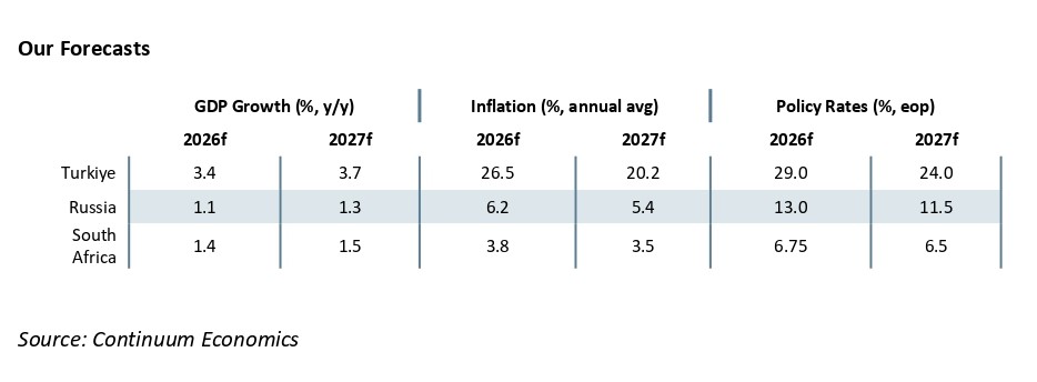 · In Turkiye, deteriorated pricing behaviour, the arrests of opposition mayors, sticky services prices continue to risk the disinflationary process couple with loss in investor confidence and currency volatility. Our average inflation forecasts stand at 26.5% and 20.2% for 2026 and 2027 respectively since inflation expectations and pricing behavior remain fragile. We think Central Bank of Republic of Turkiye (CBRT) will likely reduce the rate to 29% by end-2026, while stubborn inflation will limit the size of the cuts. We forecast the economy to expand by 3.4% in 2026 and 3.7% in 2027 backed by robust investments, construction projects and government spending while high inflation and tighter fiscal stance will continue to dent growth. A high risk exists that the presidential election could occur Oct-Nov 2027 rather than 2028.