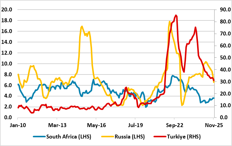 Figure 1: South Africa, Russia (LHS) and Turkiye Inflation (RHS) (%, YoY), January 2010 – November 2025