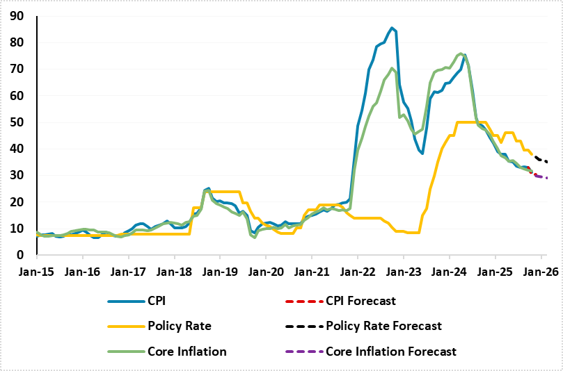Figure 6: CPI, Core Inflation (YoY, % Change) and Policy Rate (%), January 2015 – November 2025