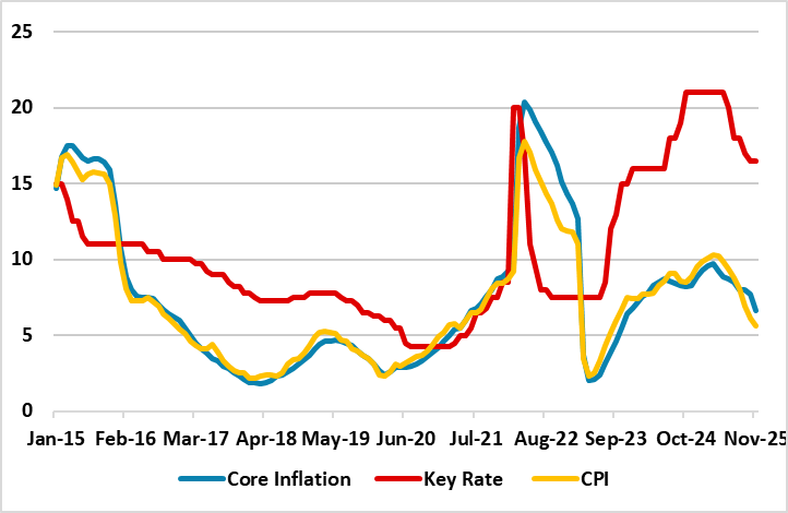When it comes to growth, the main driver for Russian GDP growth remains the surge in military spending, supported by the improved consumer demand amid greater outlays on social support, higher wages and strong fiscal stimulus. Russia's GDP expanded by a moderate 0.6% y/y in Q3 2025, marking the slowest rate of growth since Q1 2023 showing the economic slowdown in Russia is more evident now. We think CBR’s previous aggressive monetary tightening coupled with sanctions, supply side constraints, low crude oil prices, softening natural gas exports due to European sanctions, relative RUB resilience and stubborn price pressures are headwinds for the economy.