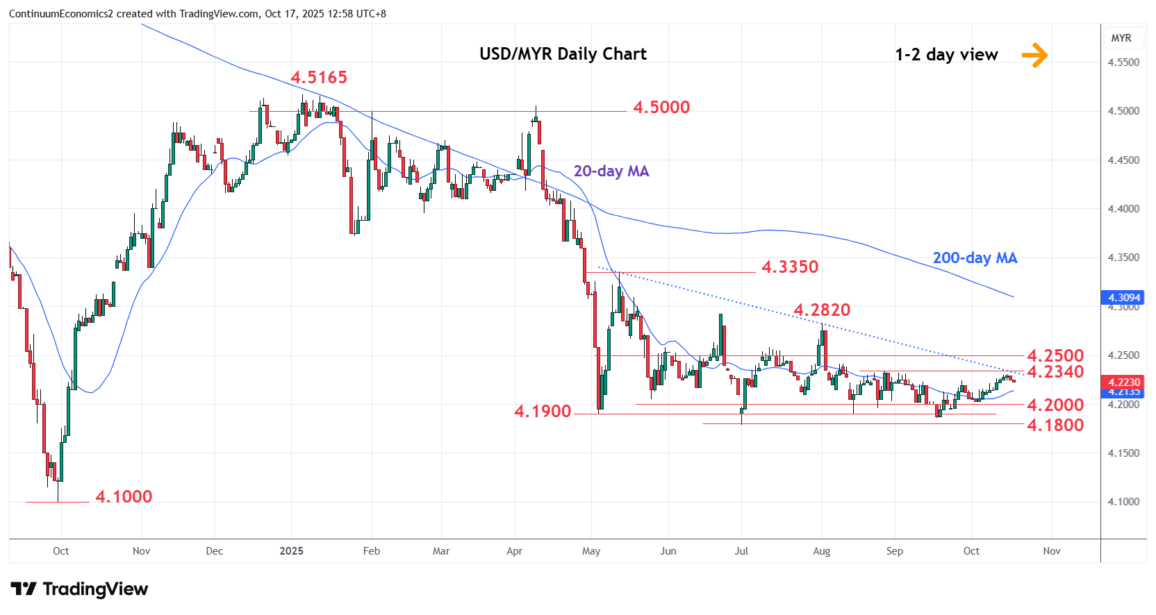 05:10 GMT - Settling back from test of the 4.2300/40 resistance as prices unwind overbought daily studies. However, further gains cannot be ruled out and clearance will open up room for stronger gains to retrace the August/September losses to resistance at the 4.2400 level and 4.2500/4.2600 congestion area. However, corrective gains are expected to give way to selling pressure later to retest the 4.2000 support. Break here will return focus to the downside for retest of the 4.1900/4.1800 lows and threaten deeper pullback to retrace the 2024/2025 rally.