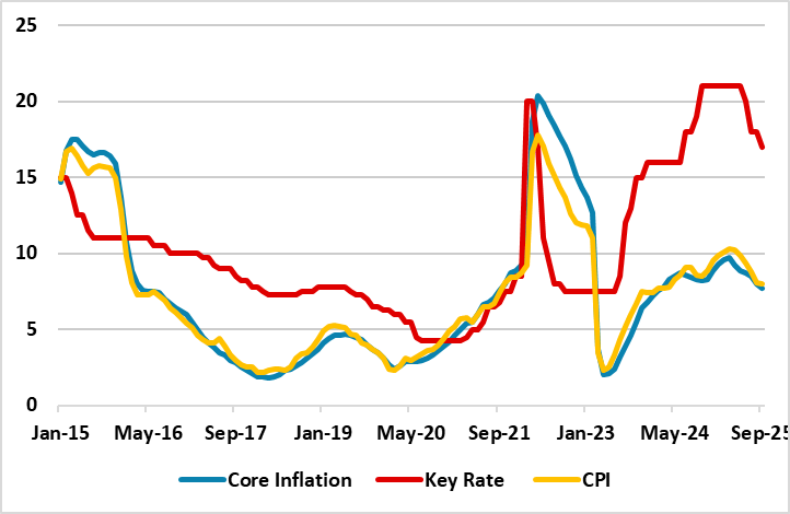 It is worth mentioning that CBR highlighted in its written statement in September that it will maintain a level of monetary policy tightness necessary to bring inflation back to target at 4% by 2026. We still believe reaching 4% target will be tough in 2026, since cooling off inflation will take longer than CBR anticipates as war in Ukraine continues with pace, military spending remains elevated, sanctions dominate, and global uncertainties remain strong.