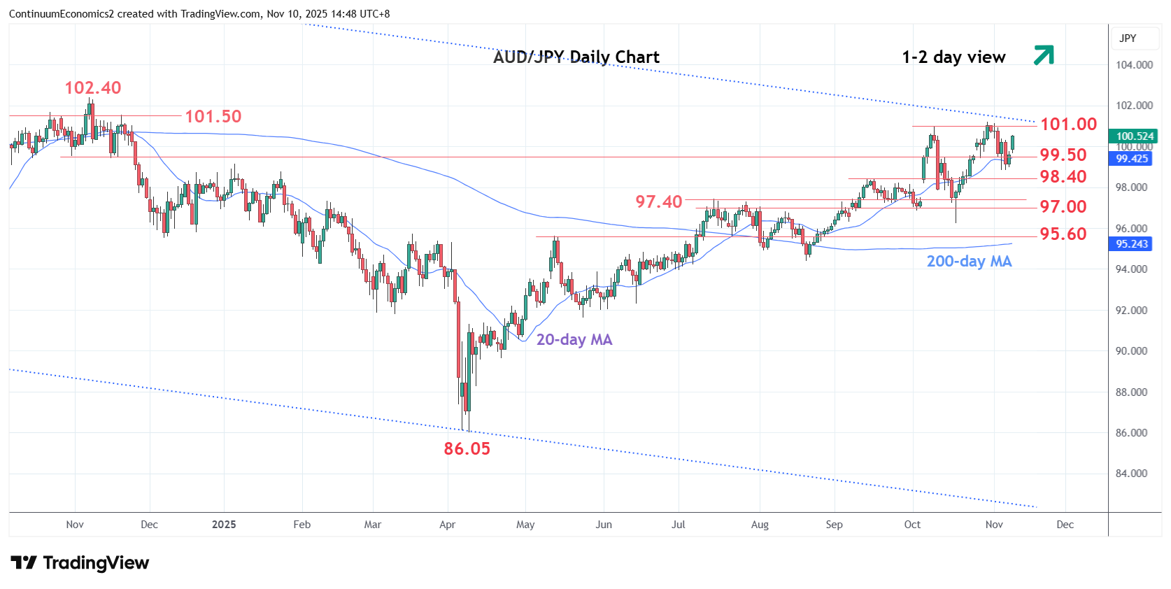 07:00 GMT - Bounce from the 98.82 low to regain the 100.00 level return focus to the 101.20, October current year high and channel resistance from July 2024 year high. Break here will further extend the April gains and see room for extension to 101.50 congestion then the 102.40 high of November 2024. Meanwhile, support is raised to 99.50 congestion and extending to the 98.82 low of last week. Would take break of these to open up room for deeper pullback to strong support at the 98.40/97.40, the September/July highs.