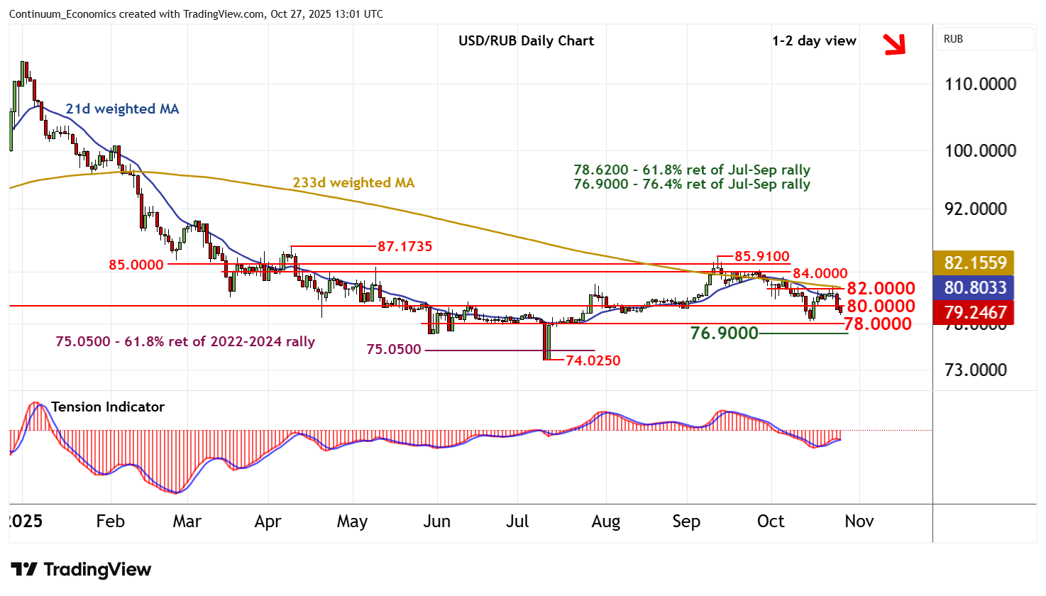 12:45 GMT - The test of congestion resistance at 82.0000 has not been sustained, as overbought daily stochastics unwind, with steady selling interest posting a break below 80.0000 to currently trade around 79.2500. The daily Tension Indicator has also turned down and broader weekly charts are under pressure, highlighting room for continuation down to the 78.2270 weekly low of 15 October and congestion around 78.0000. A close beneath here would add weight to sentiment and extend September losses towards the 76.9000 Fibonacci retracement, where short-covering/consolidation is expected to appear. Meanwhile, a close back above congestion resistance at 80.0000 would help to stabilise price action and prompt consolidation beneath 82.0000.