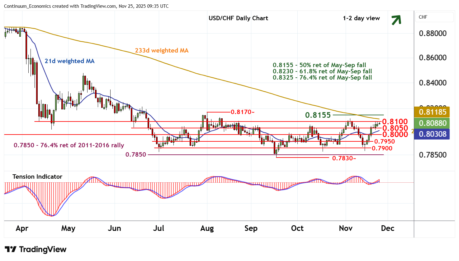 09:25 GMT - Still little change, as prices extend cautious trade within the 0.8050 - 0.8100 range. Daily readings continue to rise, highlighting room for fresh tests higher. A close above resistance at the 0.8100 break level would improve sentiment and extend mid-September gains towards the 0.8155 Fibonacci retracement. However, mixed weekly charts are expected to limit any initial tests in consolidation. Meanwhile, support remains down to the 0.8050 break level, and should underpin any immediate setbacks.