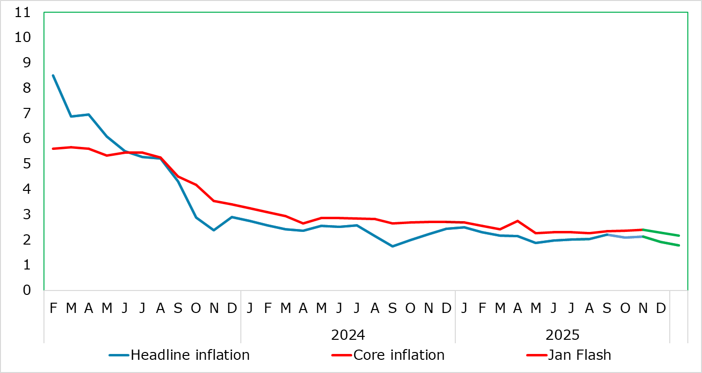In flat we see official headline core inflation slipping toward 2% in coming months even when adverse energy base effects may pull the headline figure back higher (to 2% in Q2) this year.