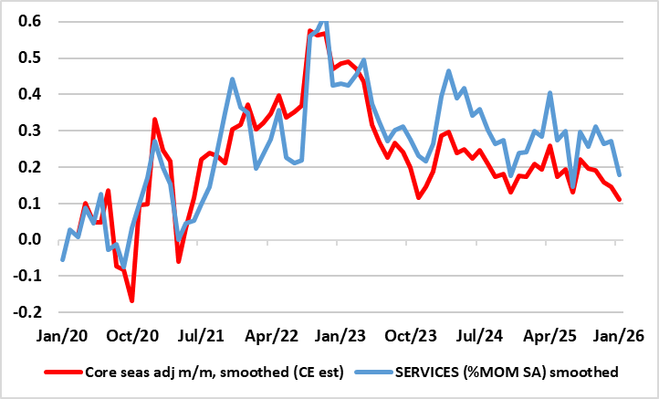 Regardless, the diehard hawks at the ECB will have focused on the recent rise in services inflation to a seven month high of 3.4%, a shift higher far less echoed by less favourable, but still target-consistent, adjusted m/m data. Even so, this seems to have reverberated within the ECB and seemingly prompted the upward revisions to the 2026 HICP outlook. Even so, the fresh fall back to 3.2% which we envisage (seemingly very much transport price driven) will not placate the hawks. What may do so is the other component of core inflation.