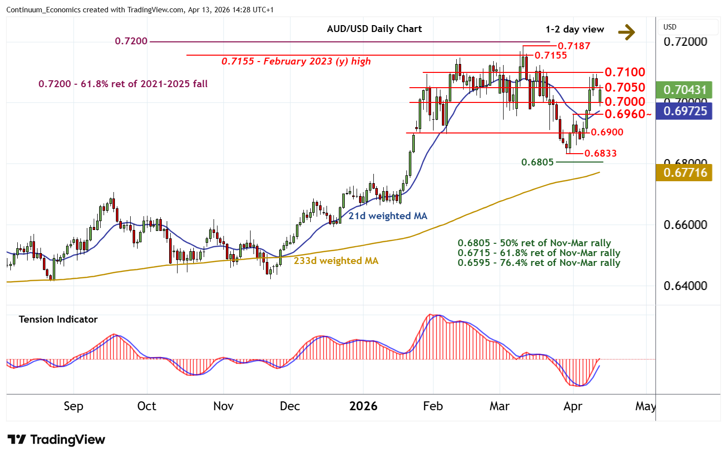 14:20 BST - The opening gap lower has bounced from congestion support at 0.7000, with prices currently balanced around congestion resistance at 0.7050. The rising daily Tension Indicator highlights room for a test back above here. But a tick lower in overbought daily stochastics and mixed weekly charts should limit initial scope in renewed consolidation beneath further congestion around 0.7100. Meanwhile, support is raised to 0.7000. But a close below the 0.6960 weekly high of 1 April would turn sentiment neutral and prompt fresh consolidation above support at the 0.6900 break level.