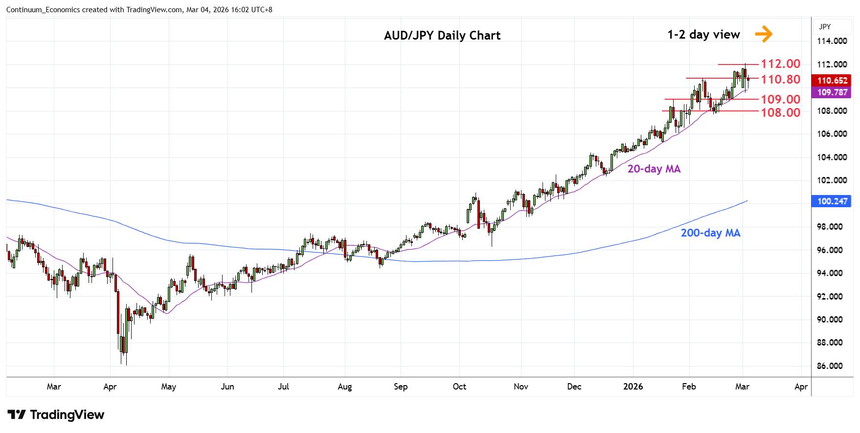 08:10 GMT - Lower in consolidation from fresh multi-year high at the 112.00 congestion from September 1990. Deep overbought daily and weekly studies caution corrective pullback and break of the 110.00 conestion will open up room for deeper pullback to correct strong gains from the 86.05, April 2025 year low. Lower will see room to the strong support at the 109.00 congestion and 108.00/107.80 area. Meanwhile, break above the 112.00 high will see room to extend gains to 113.00/114.00 congestion area.