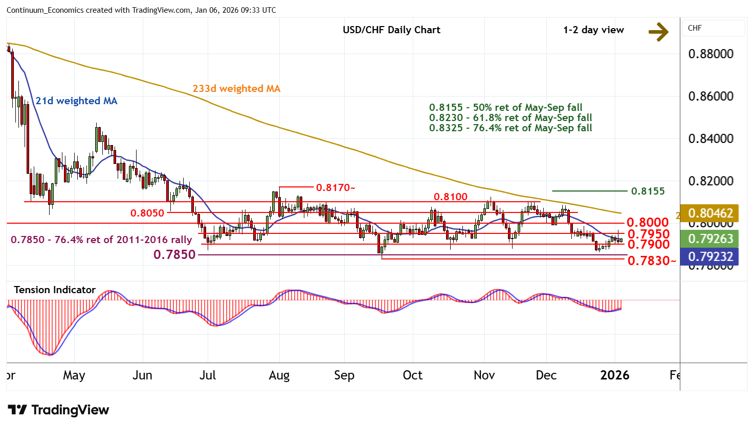 09:25 GMT - Anticipated gains failed to make much headway beyond congestion resistance at 0.7950, with prices falling back from 0.7965~ to congestion support at 0.7900. Mixed intraday studies are prompting consolidation above here. Overbought daily stochastics are flattening and the rising daily Tension Indicator is showing early signs of flattening, suggesting any fresh tests above 0.7950 should meet renewed selling interest beneath congestion around 0.8000. Following cautious trade, bearish weekly charts highlight room for renewed losses. However, a close below critical support at the 0.7850 Fibonacci retracement and the 0.7830~ year low of 17 September 2025 is needed to add weight to sentiment and extend long-term losses initially towards 0.7800.