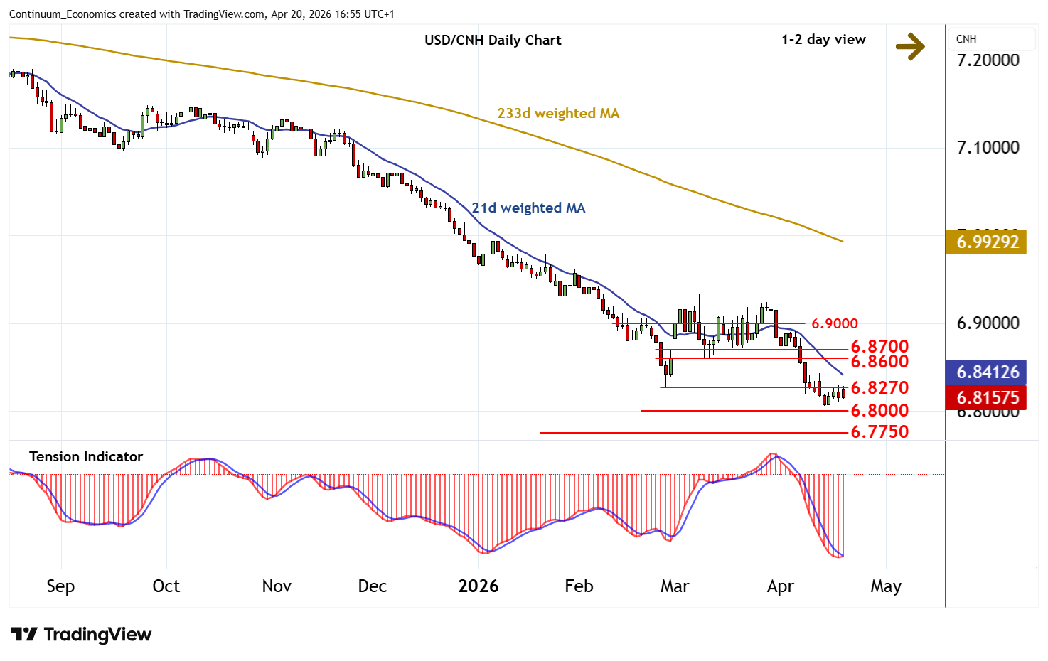 16:50 BST - Little change, as prices extend cautious trade beneath resistance at the 6.8270 monthly low of 26 February. Oversold daily stochastics are unwinding, suggesting room for a test above here. But the bearish daily Tension Indicator and negative weekly charts should limit scope in renewed selling interest beneath resistance at the 6.8600 - 6.8700 range. Following cautious trade, fresh losses are looked for. But a close below critical support at 6.8000 is needed to turn sentiment negative and extend broad April 2025 losses initially towards congestion around 6.7750.