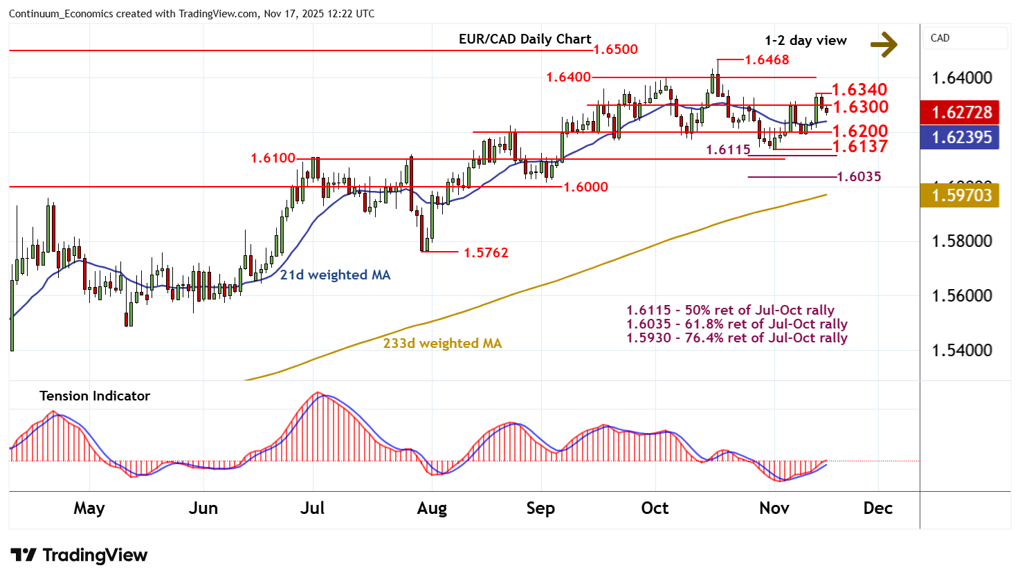 12:10 GMT - The break above congestion resistance at 1.6300 has been pushed back from 1.6340, as intraday studies turn down, with prices currently trading back below 1.6300 around 1.6275. Rising daily stochastics are flattening just below overbought areas, suggesting potential for further tests lower. But the positive daily Tension Indicator and mixed weekly charts should limit any immediate losses in renewed buying interest/consolidation above congestion support at 1.6200. Meanwhile, resistance remains at 1.6300 and extends to 1.6340. A close above, if seen, would improve sentiment and extend November gains towards 1.6400, where fresh selling interest is expected to appear.