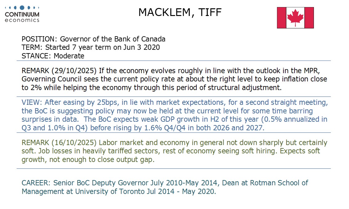 The Bank of Canada delivered a hawkish easing, cutting rates for the second straight meeting by 25bps, to 2.25%, but stating that if inflation and activity evolve in line with its projection, the current rate is seen as about the right level to keep inflation close to 2% while helping the economy through this period of structural adjustment (brought about by US tariffs).