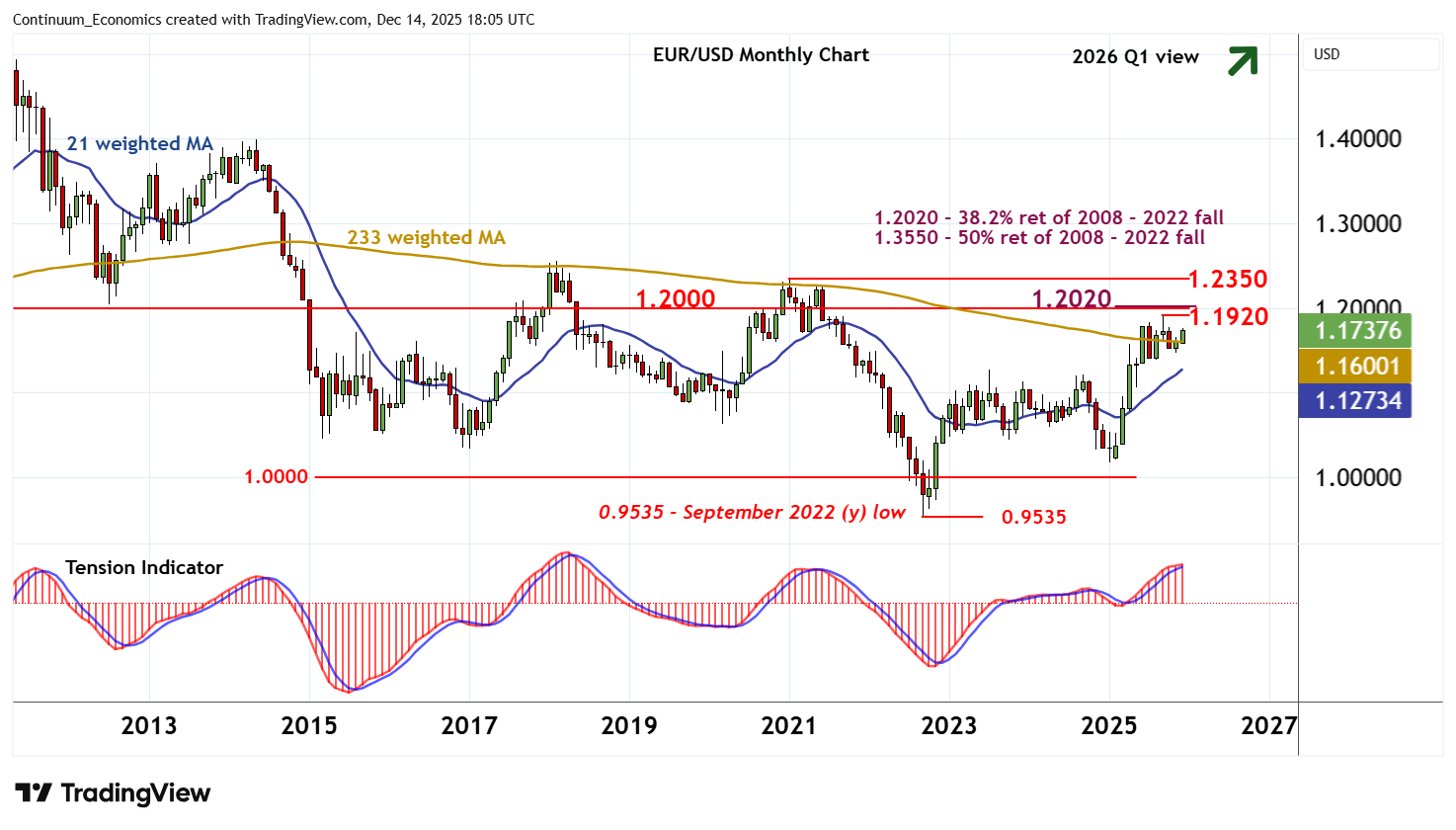 Overbought monthly stochastics continue to unwind, suggesting room for further consolidation. But the rising monthly Tension Indicator is expected to prompt fresh buying interest and extend gains from the 0.9535 multi-year low of September 2022.