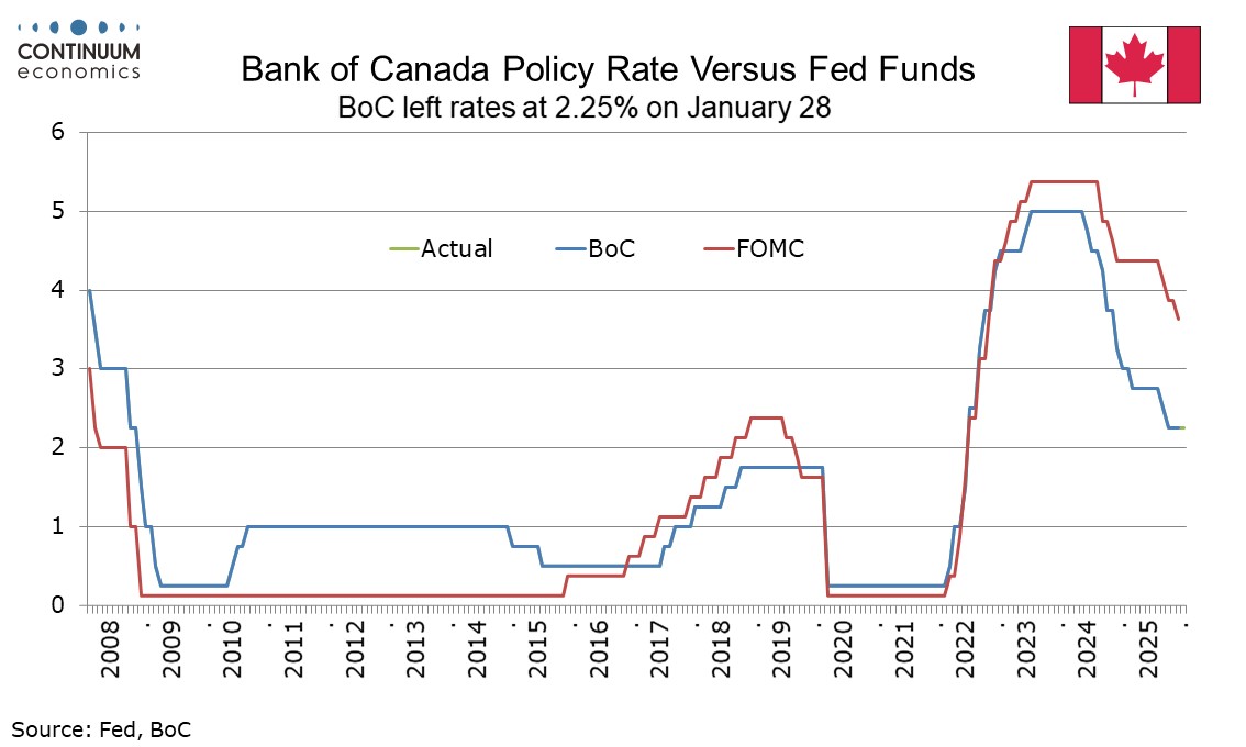 The Bank of Canada left rates unchanged at 2.25% as expected and continues to see the current policy rate as appropriate, Governor Macklem stating updated economic forecasts have not changed significantly since October. However in highlighting heightened uncertainty the statement appears to leave risks that the next move will be lower as somewhat higher, even if we do not expect that to be the case.