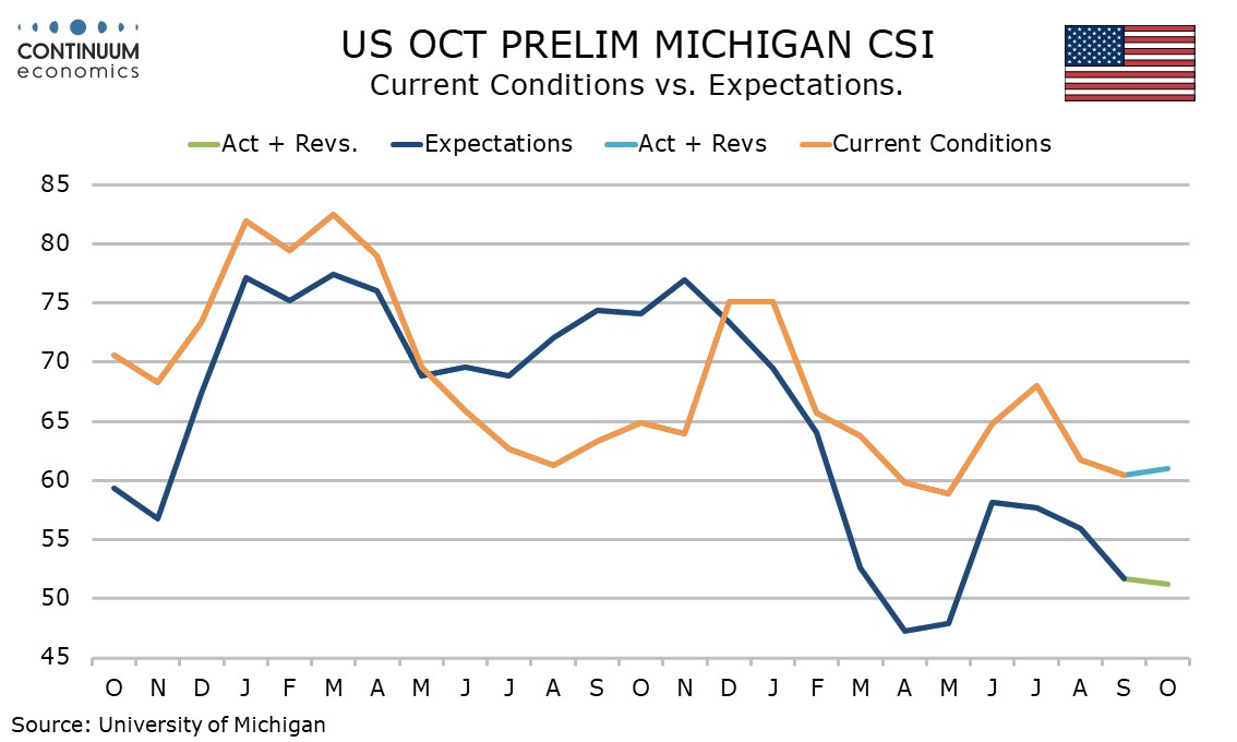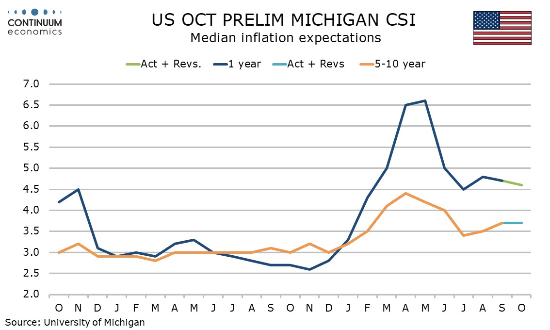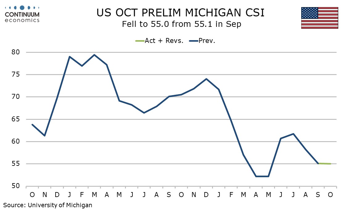 October’s preliminary Michigan CSI of 55.0 is almost unchanged from September’s final of 55.1, if the weakest outcome since May. Inflation expectations were also little changed, the 1-year view down to 4.6% from 4.7% and the 5-10 year view unchanged at 3.6%.
