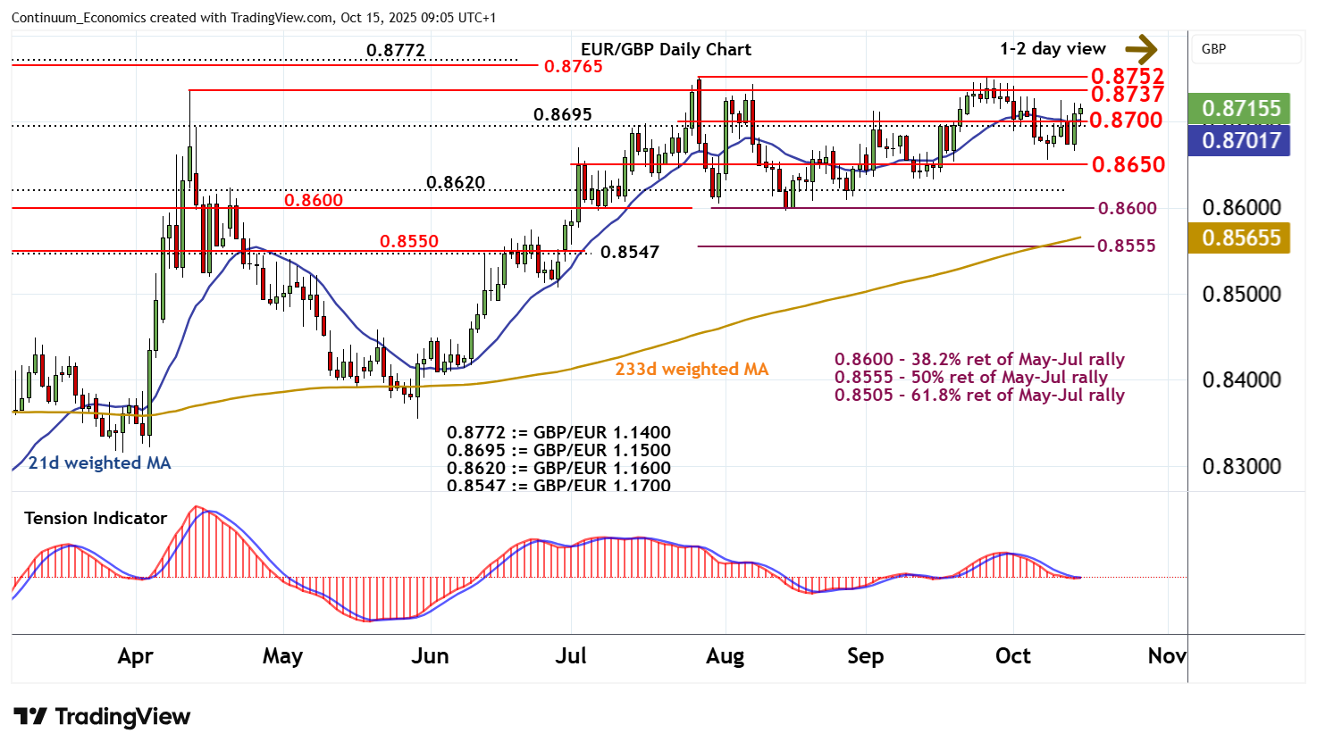EUR/GBP is very slightly firmer after this morning’s August GDP data came in in line with consensus at 0.1% m/m. The 3m/3m trend remains fairly solid at 0.3%, and a flat number in September would see Q3 growth at 0.2% q/q. This is still stronger than the Eurozone performance, and is unlikely to convince the BoE that there is any urgent need for rate cuts, with inflation still well above target. EUR/GBP has edged a little higher, but is struggling to move far away from the 0.87 level. The year’s high above 0.8760 remains out of reach for now.