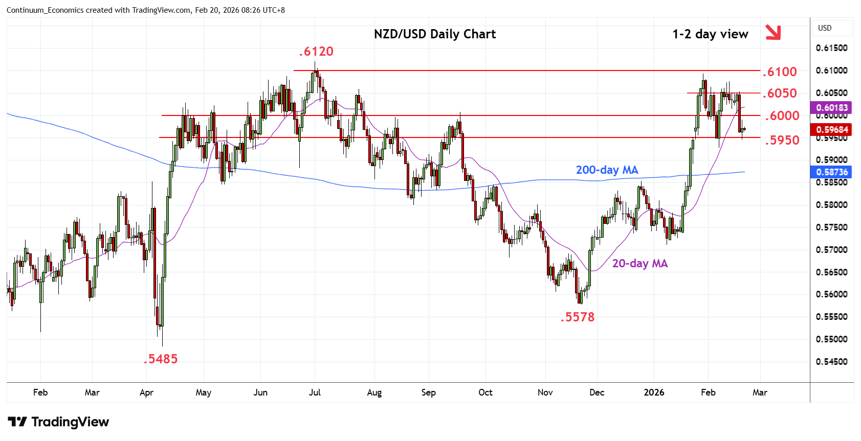 00:30 GMT - Consolidating test of support at the .5950 congestion but pressure remains on the downside and see risk for break here to extend pullback from the .6076 high of last week. Break will expose the 6 February swing low at .5928 to retest. Below this will see room for deeper pullback to retrace the November/January rally and see scope to target the .5900 level and 38.2% Fibonacci level. Meanwhile, resistance is lowered to the .6000 congestion. Would need to regain this to ease the downside pressure and further extend consolidation within .6100/.5950 area.