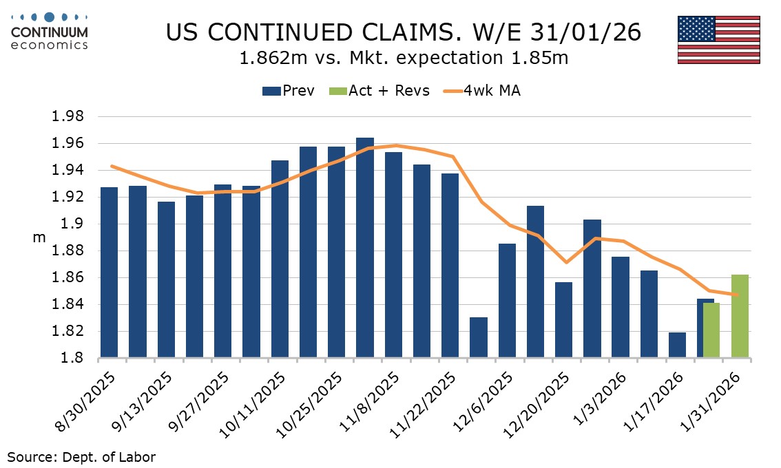 Continued claims cover the week before initial claims and this week’s outcome is also higher than expected, at 1.862m from 1.841m, though here the 4-week average is still falling, reaching its lowest level since October 2024. The recent gains in initial claims are not a strong signal of labor market weakness.
