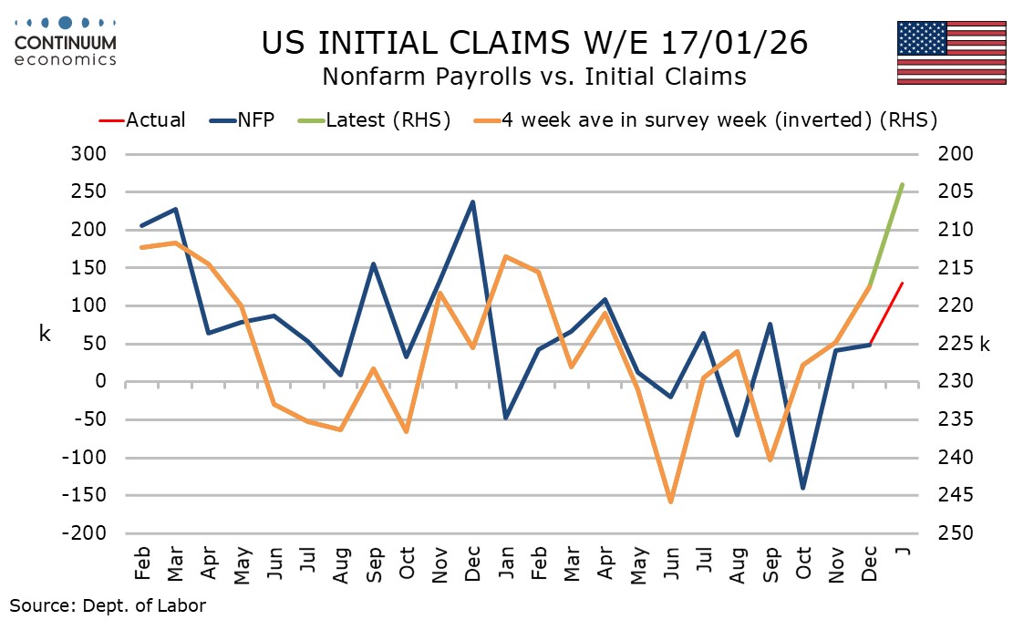 Initial claims at 227k are down from 232k but still higher than expected and higher than the seven preceding weeks. We suspect weather is playing a part in the recent upturn in initial claims, though the data suggests that February’s payroll will not be as strong as January’s.