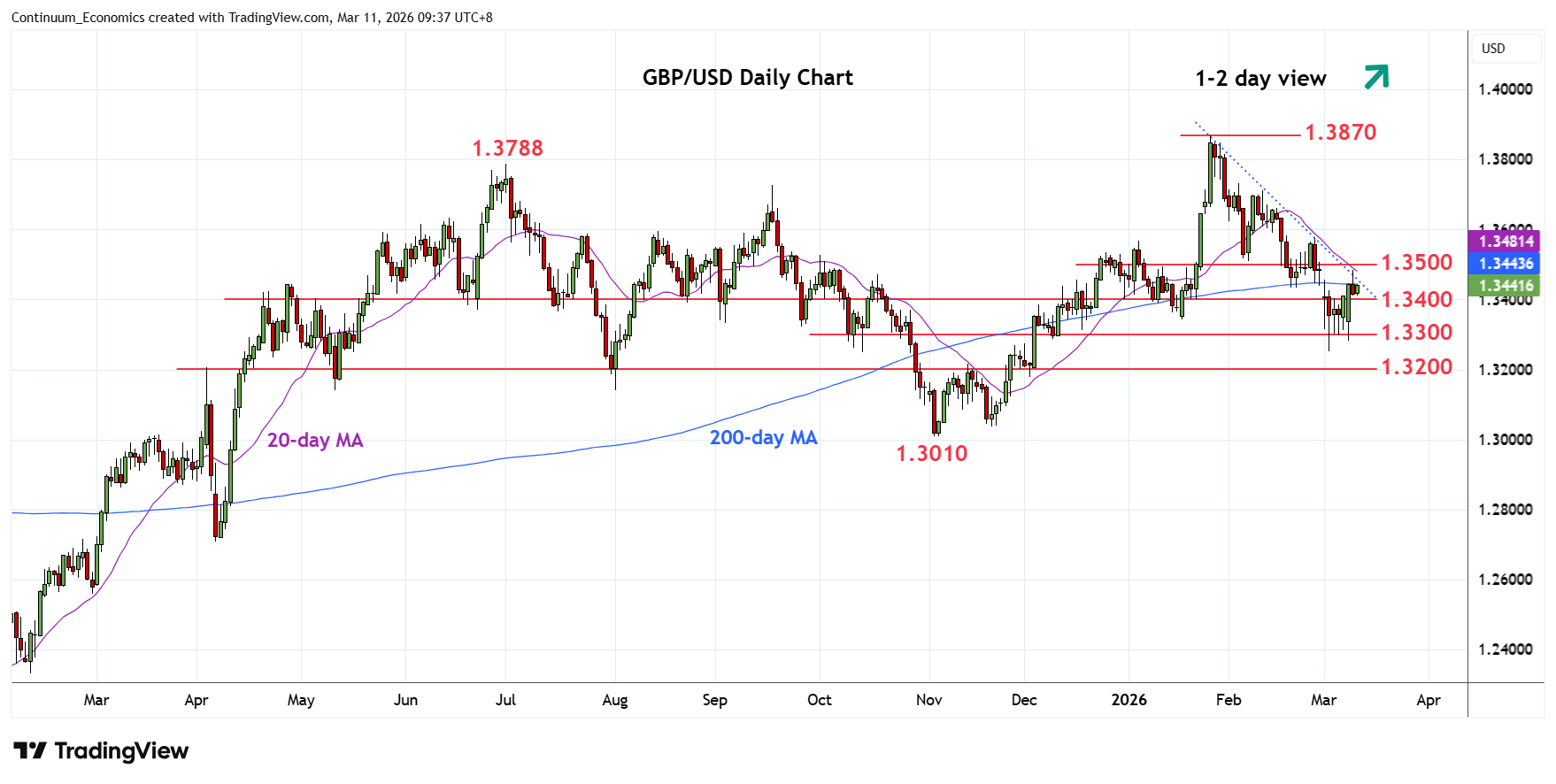 Higher in choppy trade from the 3 March current year low at 1.3253 to extend gains above the 1.3400 level