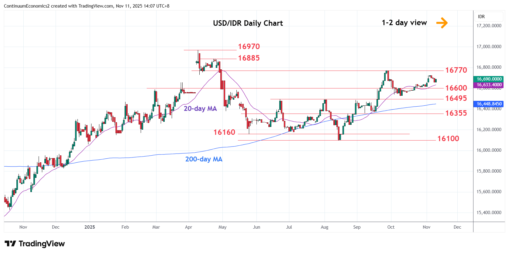 Limited on pullback from the 16725 high but overbought daily and weekly studies suggest scope for break of 16640/16600 area