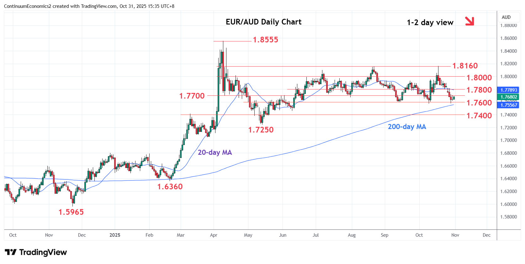 07:45 GMT - Higher in range from test of 1.7600/1.7570 September/October range lows as prices consolidate losses from the 1.8160 high. Bounce here see prices unwinding oversold intraday and daily studies but the downside remains vulnerable. Break here will confirm a double top at the August/October highs and open up room for deeper pullback to retrace gains from the May low. Lower will see room to the 1.7500/1.7460, congestion and June low, and the 1.7400 level. Meanwhile, resistance at the 1.7700/1.7800 congestion is expected to cap and sustain losses from 1.8100/1.8160 highs.