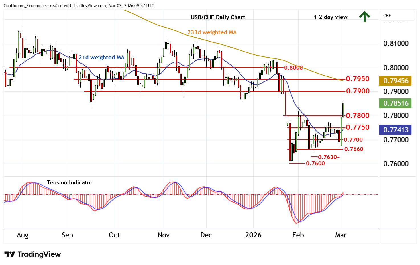 09:25 GMT - Cautious trade has given way to sharp USD- and CHF-driven gains, with the break above 0.7800 improving sentiment and completing a multi-week base above the 0.7600~ current year low of 27 January. Daily readings have turned positive and broader weekly charts are rising, putting focus on congestion resistance at 0.7900. A break will open up further congestion around 0.7950. However, by-then overbought daily stochastics could limit any initial tests in consolidation. Meanwhile, support is raised to 0.7700. A close back beneath here will turn sentiment neutral and prompt consolidation above 0.7750.