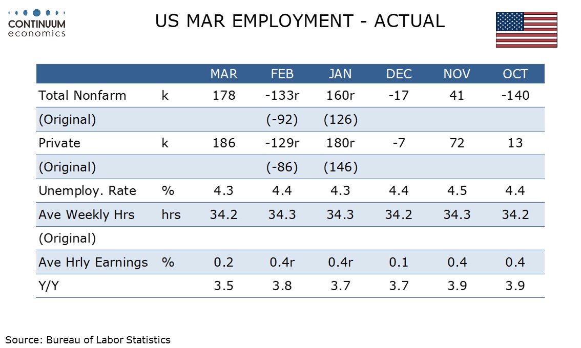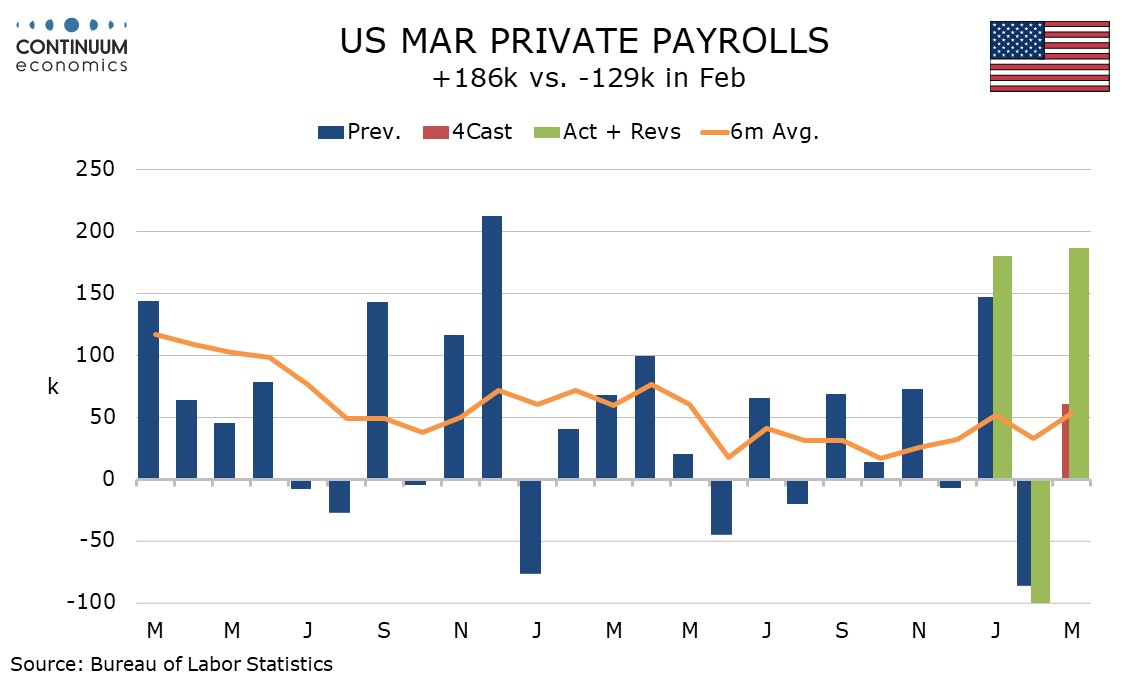 Trend through 2025 showed very limited growth in payrolls, with no month showing private payrolls moving as much as 100k in either direction, with four months negative and eight positives. 2026 has shown more volatility, with private payrolls up by 180k in January, down by 129k in February and now up by 186k in March. The respective figures for overall payrolls are up 160k, down 133k and now up 178k. February’s weak month was revised lower and January’s strong month revised higher.