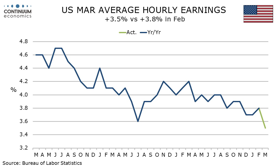 Health care remains the strongest component in the payroll detail, up by 90k and that includes 31k returning strikers who caused a rare decline of 28k in February. Gains of 26k in construction and 44k in leisure and hospitality cam be seen as weather-sensitive after February declines which were more than fully reversed. Manufacturing was up by 15k after a 6k February decline and transport and warehousing rose by 21k, though this did not reverse a 48.5k decline seen in February.