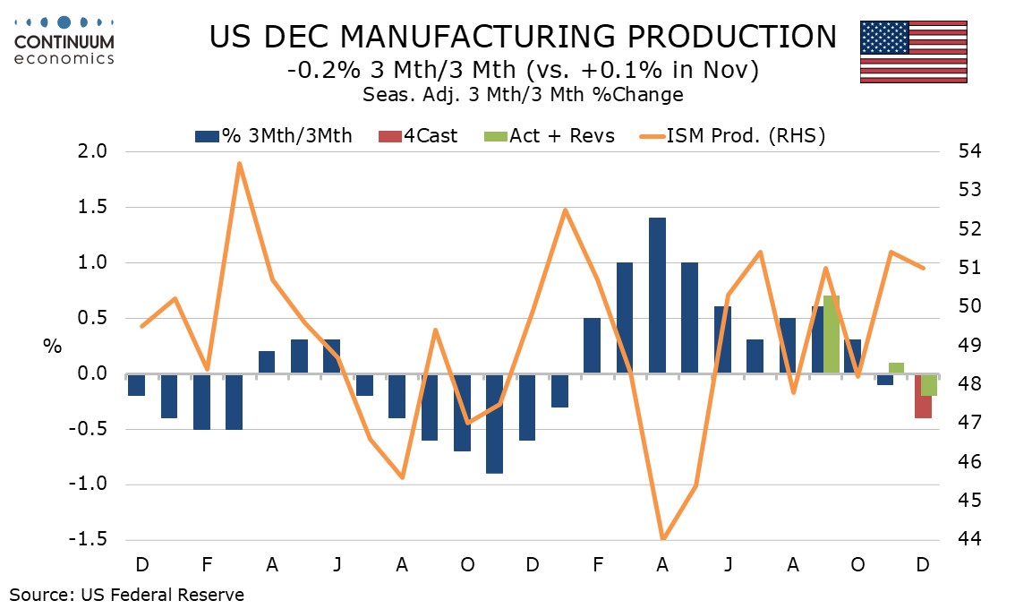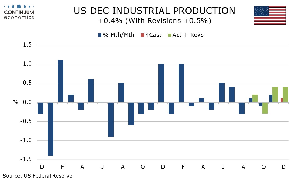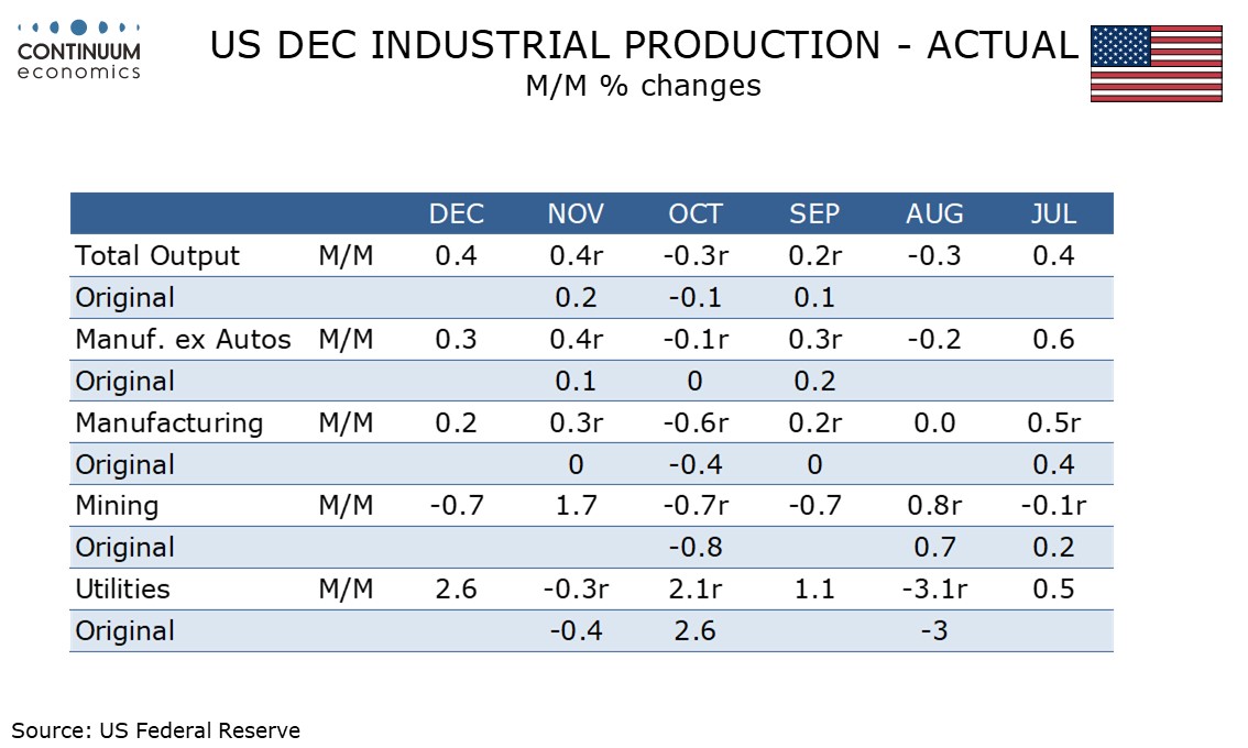 December industrial production is stronger than expected with a 0.4% increase with November revised up to 0.4% from 0.2%, though October was revised down to -0.3% from -0.1%. Manufacturing rose by 0.2%, following an upwardly revised 0.3% in November, but has still not fully erased a downwardly revised 0.6% decline in October. Manufacturing looks firmer excluding autos.