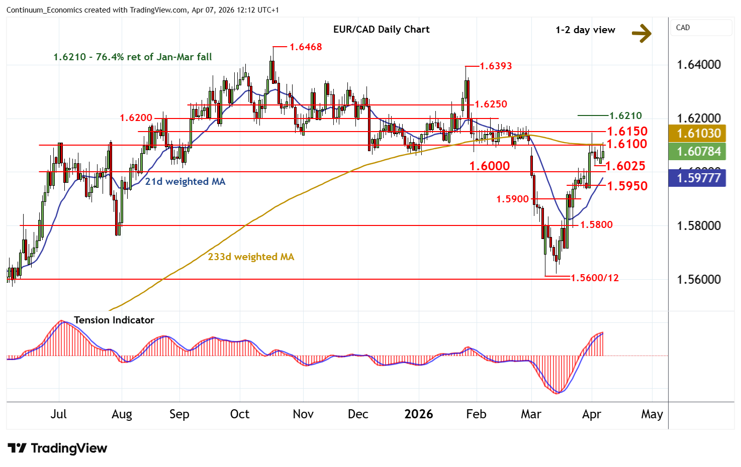 12:00 BST - Cautious trade above the 1.6025 recent lows is giving way to a move higher, as intraday studies turn higher, with prices currently pressuring resistance at the 1.6100 break level. A break will open up resistance at the 1.6145 weekly high of 1 April and congestion around 1.6150. However, positive daily readings are flattening, suggesting any immediate tests could give way to consolidation. Broader weekly charts continue to improve, but a close above here is needed to turn sentiment positive and extend March gains towards strong resistance within 1.6200/10. Meanwhile, a close below 1.6025, if seen, will add weight to sentiment and prompt a deeper pullback below congestion around 1.6000 towards the 1.5950 recent lows. Initial tests of here could give way to fresh consolidation.