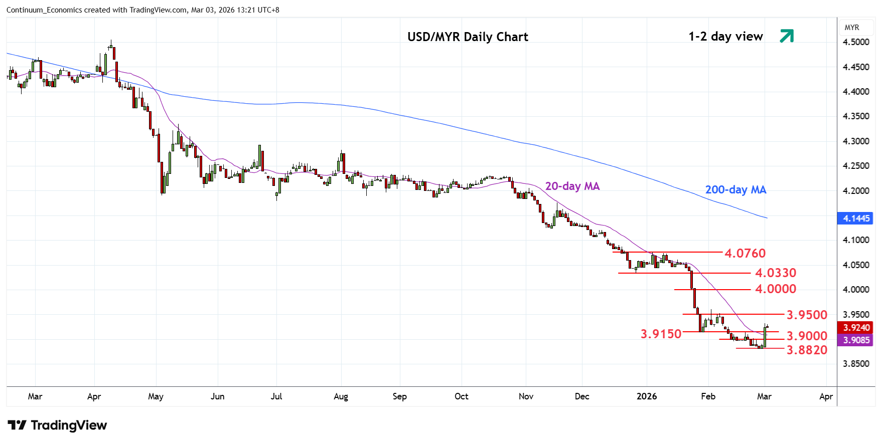05:35 GMT - Turned up sharply from the 3.8820 low as prices unwind the deep oversold daily studies to reach 3.9300 level. Weekly chart are stretched as well and suggest scope for stronger gains in the coming sessions to retrace losses from the 4.5165, January 2025 year high. Higher will see room to 3.9500 congestion then the strong resistance at 4.0000, figure and the 2021 year low. Meanwhile, support is raised to 3.9150/3.9000, January low and congestion area. This should now underpin and sustain bounce from the 3.8820, 26 February current year low.