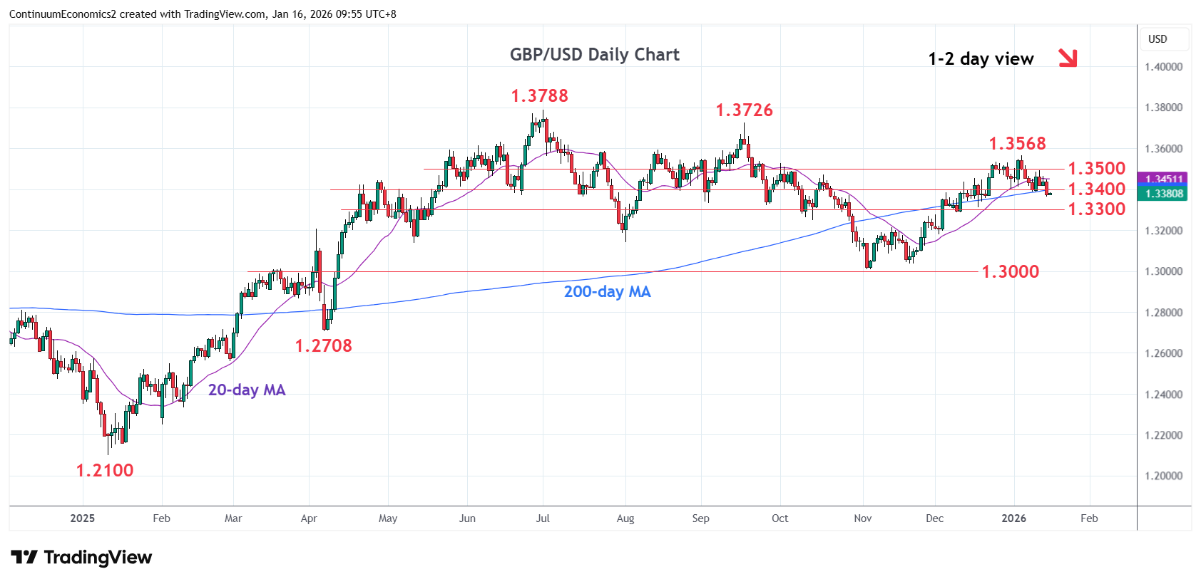 Consolidation above support at the 1.3400/1.3390 area has given way to fresh selling pressure to extend losses from the 1.3568