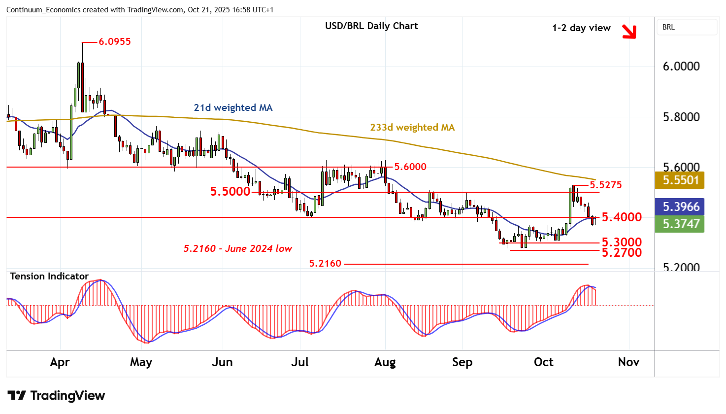 16:45 BST - The pullback from the 5.5275 weekly high of 13 October has reached 5.3725, where flat oversold intraday studies are prompting short-term reactions. Daily stochastics and the daily Tension Indicator are falling, highlighting room for continuation towards congestion support at 5.3000. But rising weekly charts should limit any deeper losses in short-covering/consolidation above critical support at the 5.2700 current year low of 18 September. A close beneath here would turn sentiment negative and extend December 2024 losses towards 5.2000. Meanwhile, a close back above congestion resistance at 5.4000 would help to stabilise price action and prompt consolidation beneath further congestion around 5.5000.