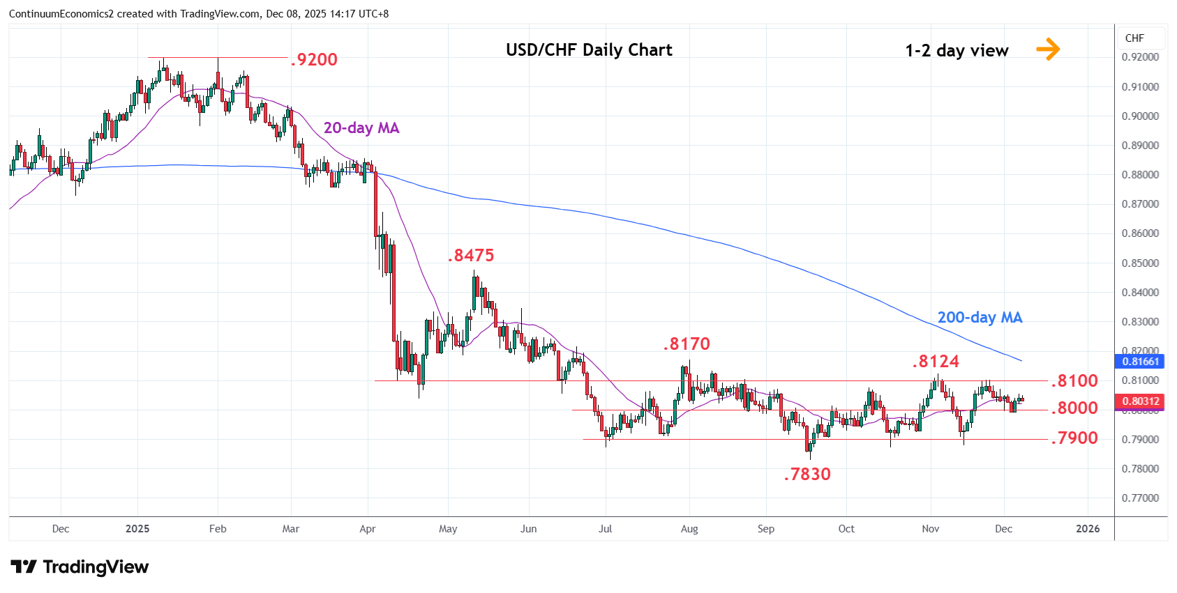 Limited on break of the .8000 level with bounce from the .7990 low extending consolidation within the .8100/.8000 range