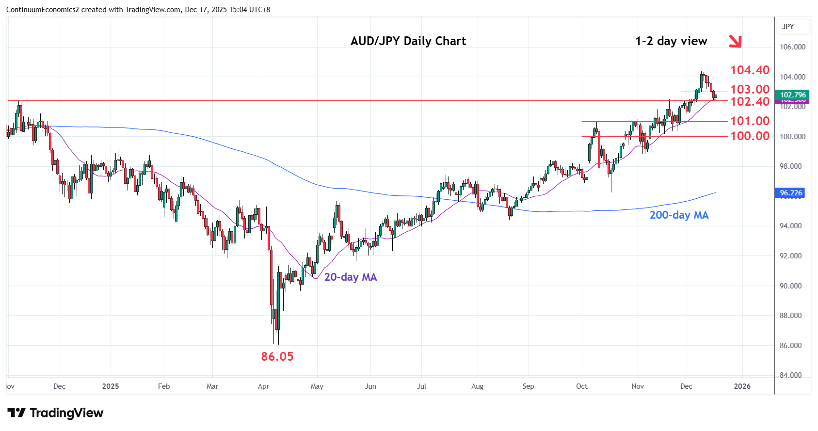 07:30 GMT - Turned up from test of support at the 102.40/102.00 congestion as prices unwind oversold intraday studies. Negative daily studies and overbought weekly studies suggest this giving way to renewed selling pressure later. Lower will extend losses from the 104.40 current year high and see room for extension to support at the 101.20/00, October highs, and the 100.00 level. Meanwhile, resistance is lowered to 103.00/20 congestion which is expected to cap. Above the 104.40 high, if seen, will see room to the 105.00/106.00, April 2024 high and congestion area.