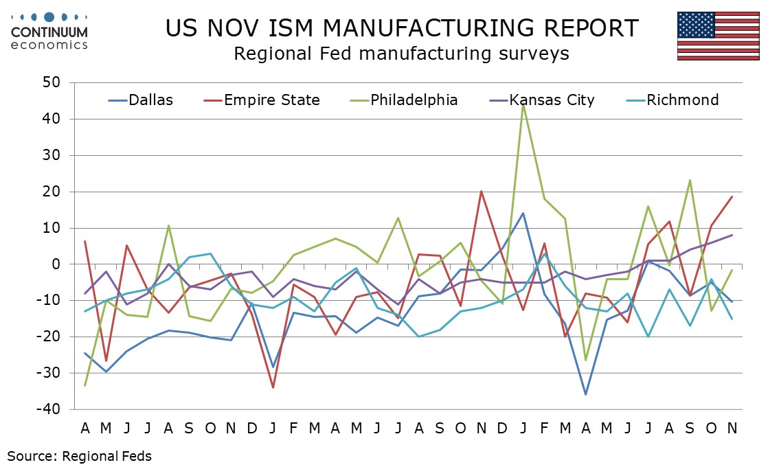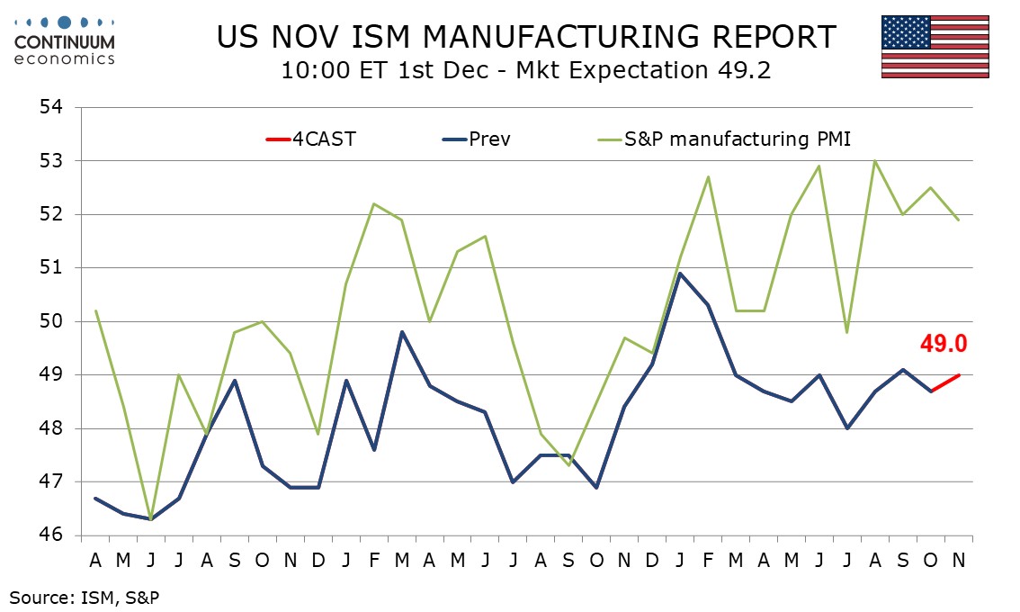 Preview: Due December 1 - U.S. November ISM Manufacturing - Firmer but still short of neutral