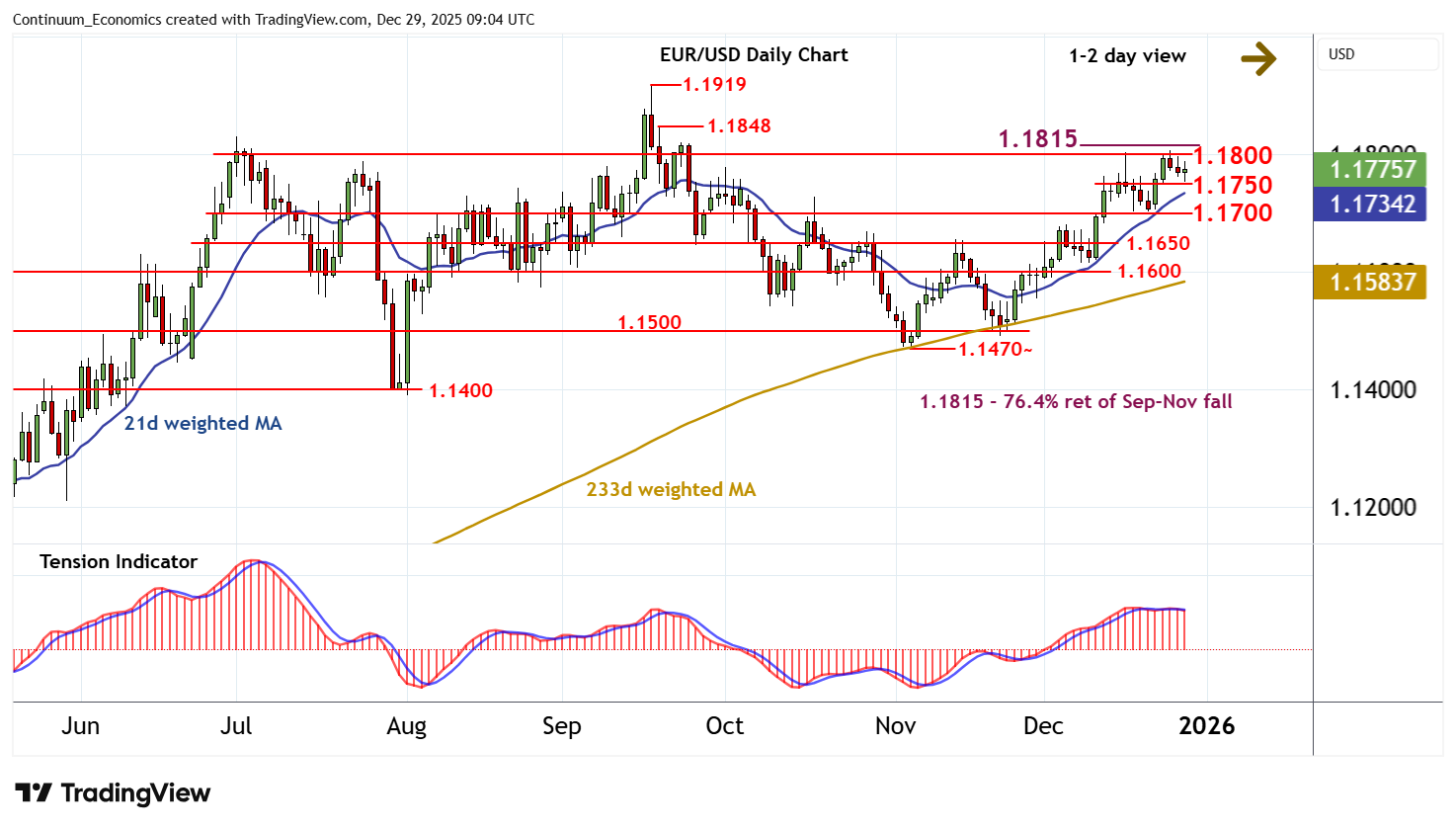 08:50 GMT - Still little change, as mixed intraday studies keep near-term sentiment cautious and extend consolidation within the 1.1750 - 1.1800/15 range. Daily stochastics are turning down, unwinding minor negative divergence, and the daily Tension Indicator is also coming under pressure, highlighting room for a drift lower. A break below congestion support at 1.1750 will open up further congestion around 1.1700. But rising weekly charts are expected to prompt renewed buying interest/consolidation towards here. Following cautious trade, fresh gains are looked for. However, a close above congestion resistance at 1.1800 and the 1.1815 Fibonacci retracement is needed to improve price action and extend November gains initially to the 1.1848 high of 18 September.