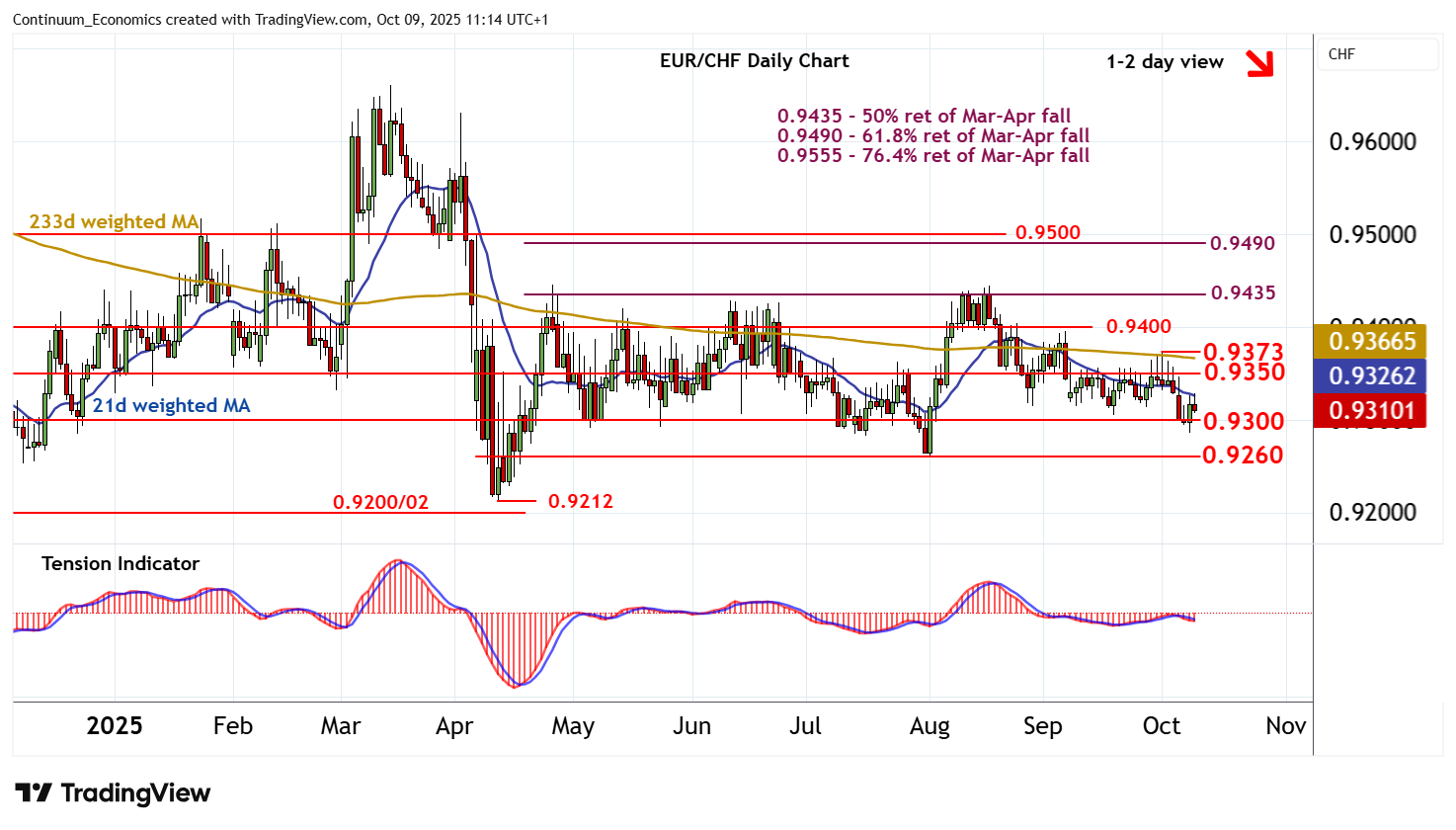 11:00 BST - Still little change, as prices extend choppy trade above congestion support at 0.9300. Daily readings are mixed/negative, suggesting potential for further consolidation in the coming sessions. But broader weekly charts are under pressure, pointing to room for a later break and extension of mid-August losses towards 0.9260. Meanwhile, resistance remains at congestion around 0.9350 and should cap any immediate tests higher.