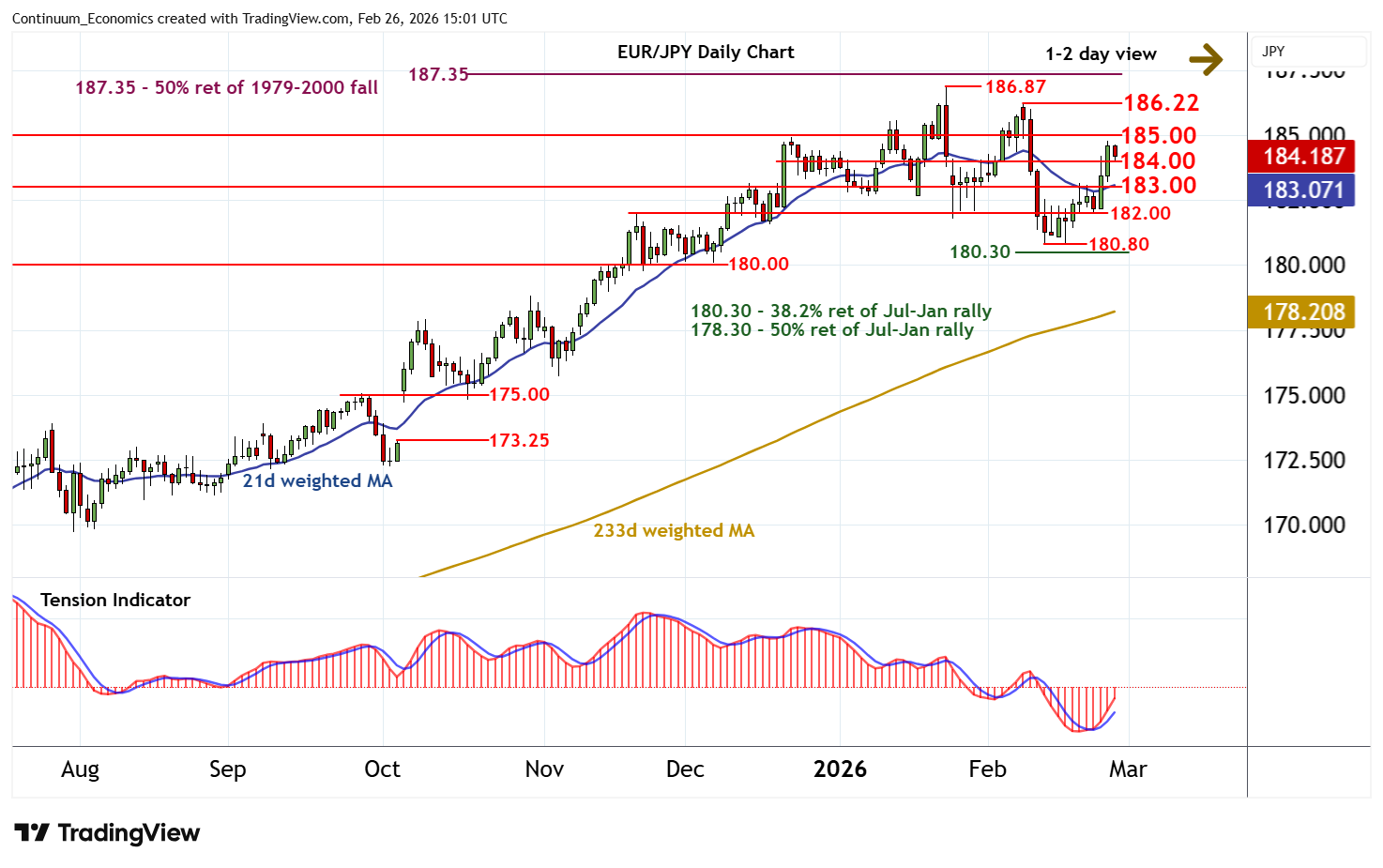 14:40 GMT - The pullback from the 184.75~ high of 25 February has reached congestion support at 184.00, where short-term consolidation is appearing. Intraday studies are falling, suggesting room for a break beneath here. But rising daily readings should limit scope in renewed buying interest above 183.00, before negative weekly charts prompt deeper losses. Meanwhile, resistance remains up to 185.00. A break, if seen, is expected to fade beneath the 186.22 weekly high of 9 February.