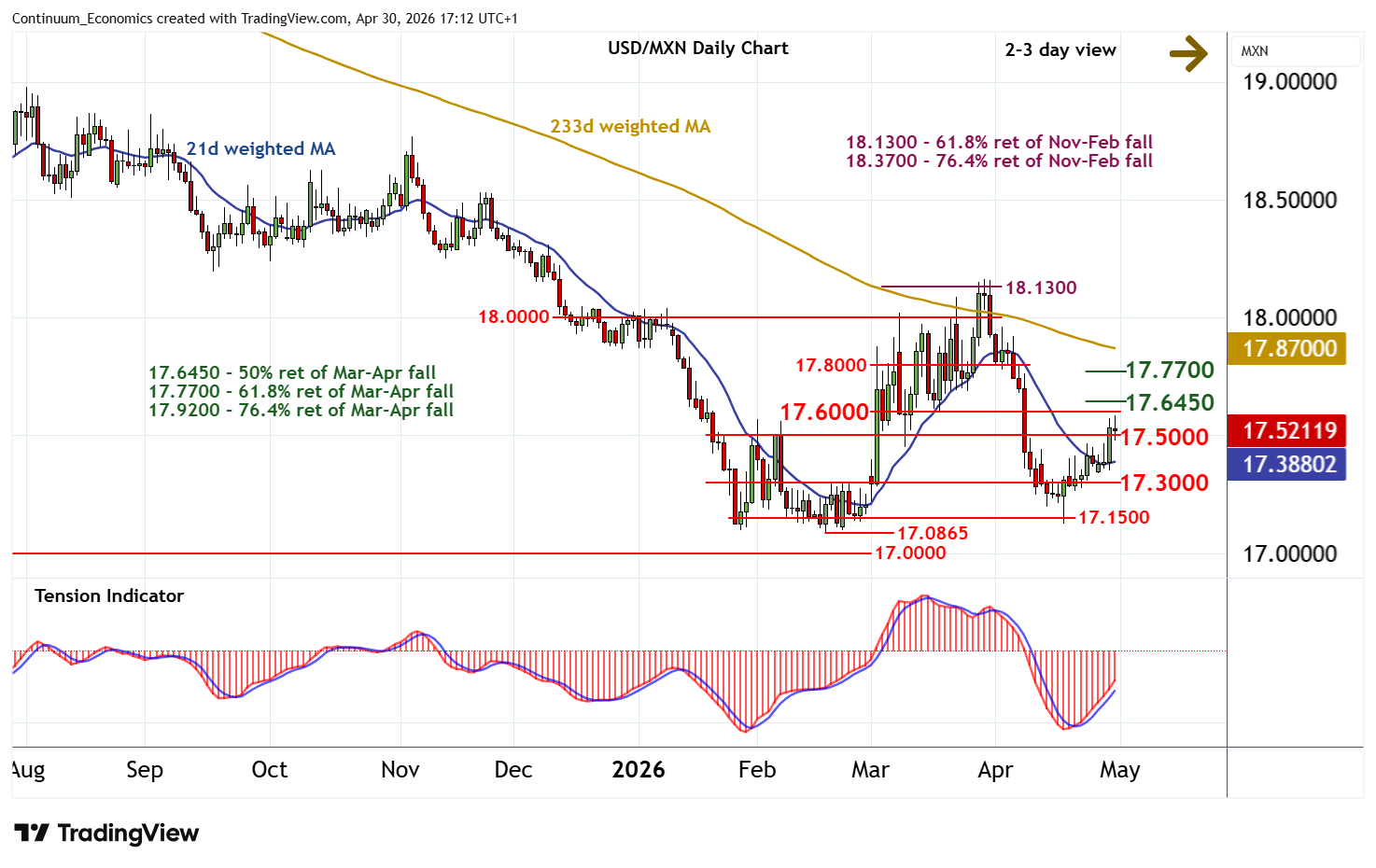 17:10 BST - Cautious trade has given way to a fresh push higher, with prices currently balanced inside the 17.5000 - 17.6000 range. Daily studies are rising, suggesting room for a test above congestion resistance at 17.6000. But already overbought daily stochastics and mixed weekly charts should limit initial scope in renewed selling interest towards the 17.6450 Fibonacci retracement. A close above here, however, will improve sentiment and extend April gains towards the 17.7700 retracement. Meanwhile, a close back below congestion support at 17.5000 will give way to fresh consolidation above 17.3000.