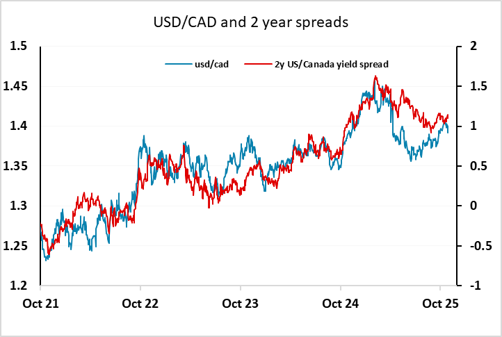 USD/CAD has moved slightly lower in response to the 25bp rate cut from the BoC, with the statement suggesting that they don’t see any more cuts in the future assuming that the economy progresses as expected. USD/CAD has only dropped around 10 pips, but front end CAD yields are up 5bps, so there could be scope for some more CAD gains from here if the Fed don’t sound more hawkish than expected after the FOMC decision later (which is expected to produce a 25bp funds rate cut). However, USD/CAD had already fallen away from the level suggested by the historic yield spread correlation in yesterday’s trading, so downside looks fairly modest. There isn’t much more scope for CAD yields to rise, as the market was not fully pricing another cut after today’s move ahead of the decision, so from here any further USD/CAD declines look likely to be dependent on declines in US yields.