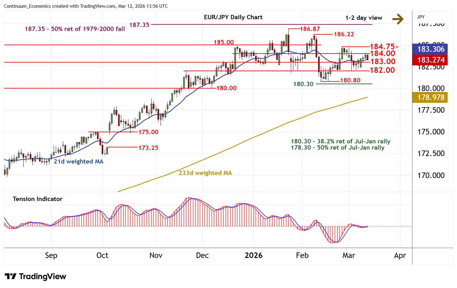 13:50 GMT - Consolidation beneath congestion resistance at 184.00 is giving way to a drift lower, as intraday studies turn down, with focus turning to support at the 183.00 break level. Flat oversold intraday studies could limit any immediate tests in consolidation. But deteriorating daily readings and negative weekly charts point to room for a later break towards congestion around 182.00. Longer-term charts are also under pressure, but a close below the 180.80/00 range is needed to turn sentiment negative and confirm continuation of late-January losses. Meanwhile, any immediate tests above 184.00 should be limited in renewed selling interest beneath the 184.75~ weekly high of 25 February.