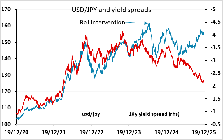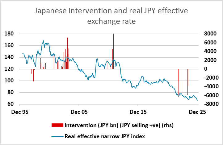 The last intervention in July 2024 triggered a USD/JPY decline of more than 20 figures to 140, and came when USD/JPY broke higher without any support from yield spreads. The divergence between US/Japan yield spreads and USD/JPY is even more striking now, so intervention would not be surprising, and could cause as sharp or an even sharper decline in USD/JPY. Indeed, we would argue that we are at the stage where intervention is necessary, because the market at the moment is trend following and the JPY will just continue to weaken if there is no opposition.